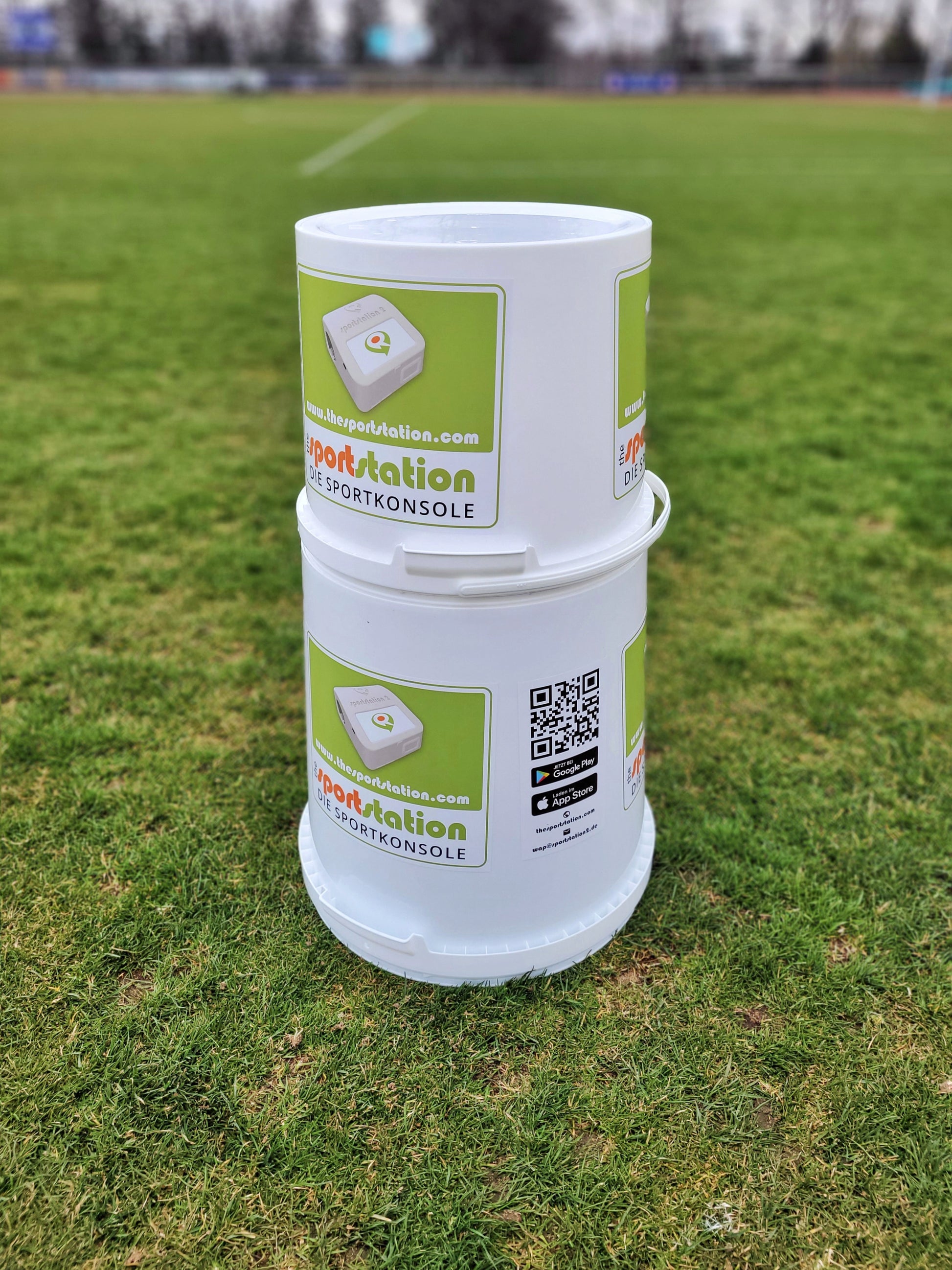 Beide Eimer sind beklebt. Der große Eimer ist mit einem QR Code versehen, der auf die sportstation2 connect App verlinkt. So können alle Athleten schnell die App finden und ihre Statistiken einsehen!