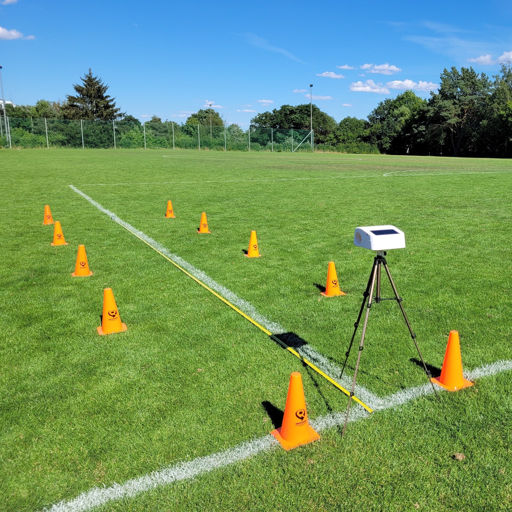 Enthält ein Stativ mit Befestigungsplatte und ein Metall-Maßband (10 m) zum exakten Positionieren der Dribbel-Hütchen.