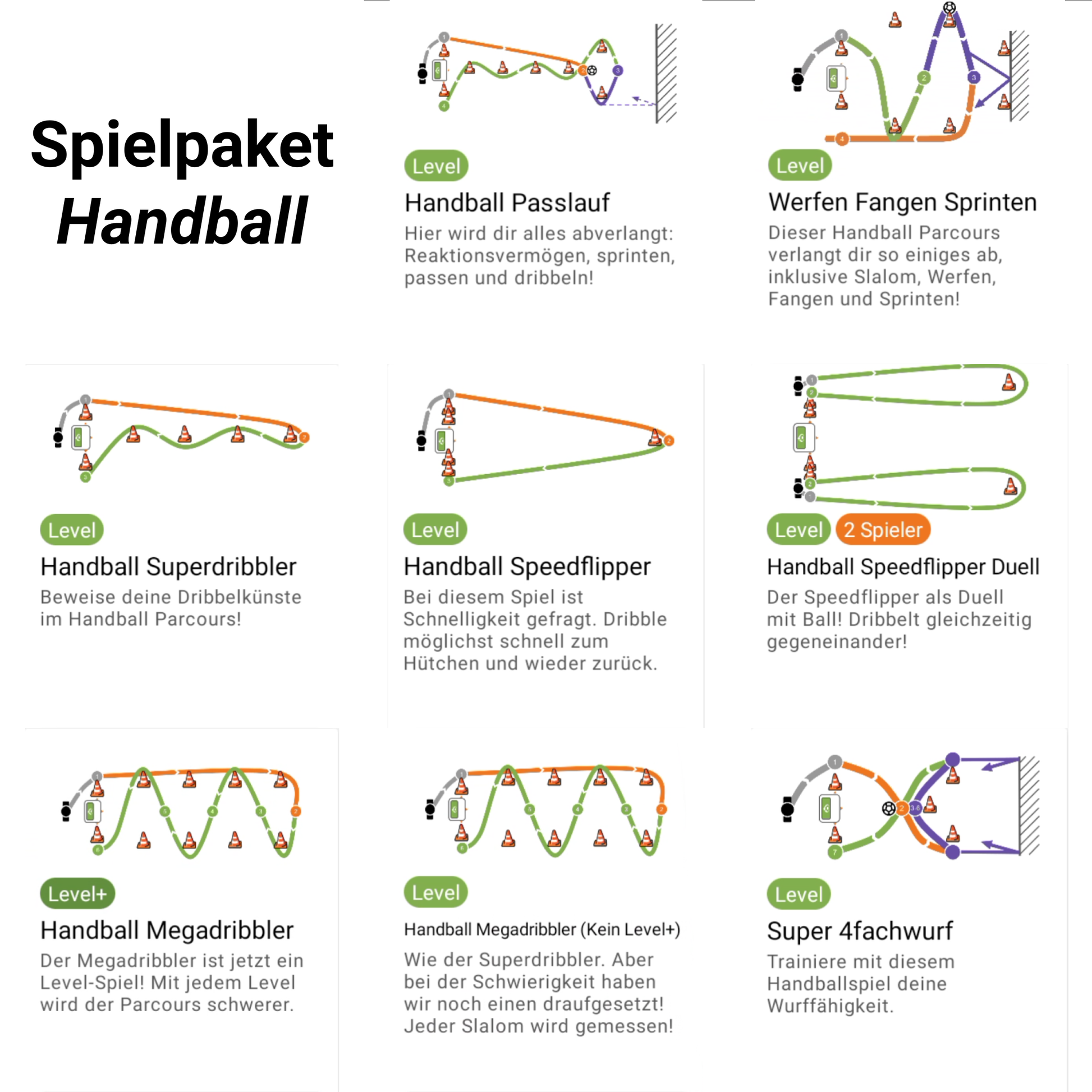 Das Spielepaket Handball bietet eine Auswahl an Handballspielen, die verschiedene Fähigkeiten trainieren: